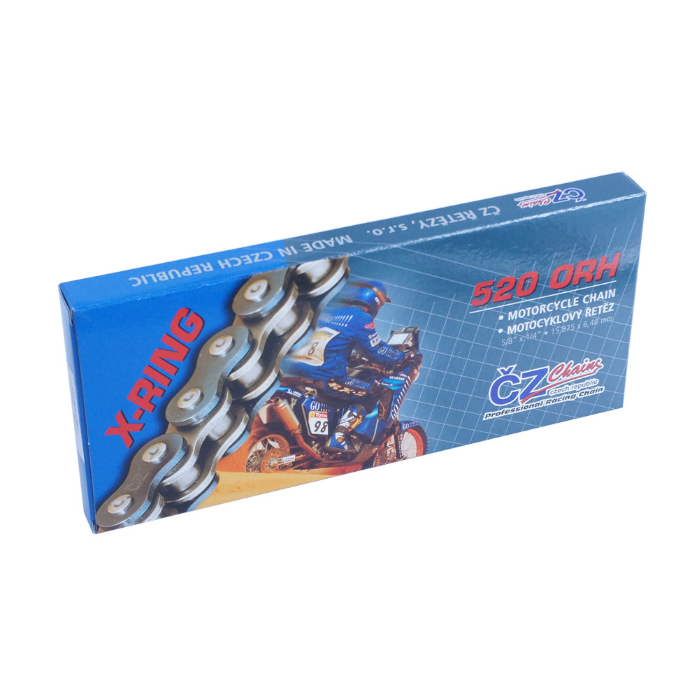 Verstärkte Version der Kette 520 ORMX. Die Außenlasche mit modifizierten Abmessungen hat der Kette ermöglicht, höhere statische und dynamische Festigkeit zu erreichen. Ideale Wahl für die leistungsfähigsten off-road Rennmotorräder und Quad. Die Kette kann auch für Straßenmotorräder eingesetzt werden.