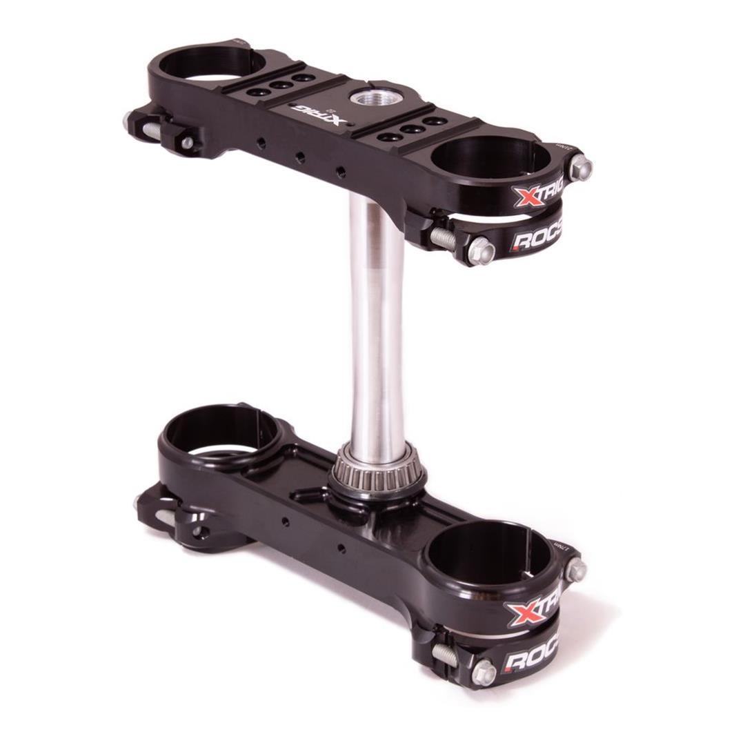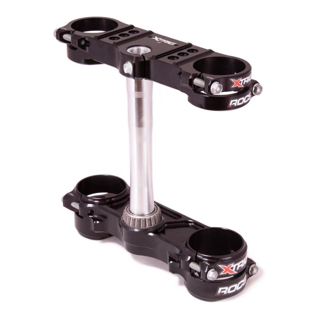 Das Revolutionary Opposing Clamp System kurz ROCS war eine der spektakulärsten und aufwändigsten Entwicklungen von XTRIG in den letzten Jahren. Die Vorteile dieses Systems im Vergleich zu einer konventionellen Gabelbrücke sind die geringere Verformung der Gabelstandrohre im Klemmbereich, was sich merklich auf das Ansprechverhalten der Gabel auswirkt. Aber auch die Konstruktion mit den beiden gegenüberliegenden Klemmschellen die durch den Selbsthemmungseffekt mehr Sicherheit gegen das Verdrehen der Gabel gewährleistet.