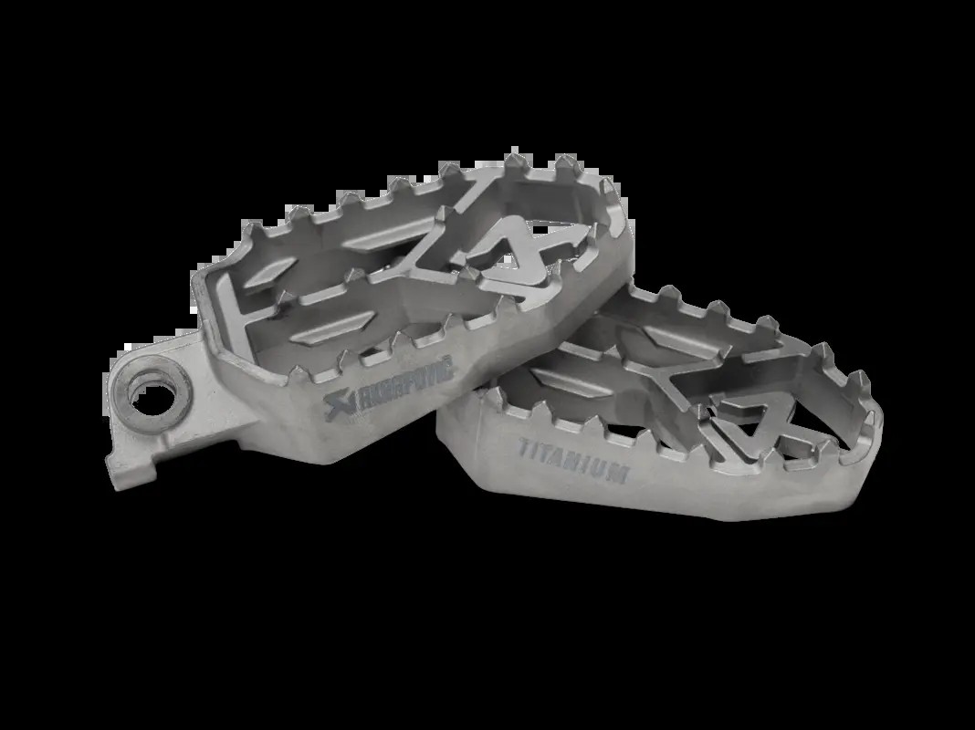Diese einteiligen Fußrasten wurden mit höchsten Anforderungen an mechanische Festigkeit und Stabilität entwickelt und bieten optimalen Halt, Grip und Komfort – on- und offroad. Die zentralen Zähne sorgen für effiziente Gewichtsverteilung und Kontrolle auf der breiten Oberfläche mit vielseitigem Layout. Die Fußrasten wurden für stehendes Fahren und Fersenabsenkung auf ausgewiesenem Enduro-Gelände entwickelt, um dem Fahrer Balance, Kontrolle und Traktion auf anspruchsvollen Trails zu bieten. Dieses Produkt wurde unter realen Bedingungen getestet und entwickelt. Das Set enthält außerdem ein Paar Gummipads. Gefertigt aus Titan der Güteklasse 5. Hinweis zur Passform: Für die Montage des Akrapovic Fußrasten-Sets muss das originale Befestigungsmaterial verwendet werden.