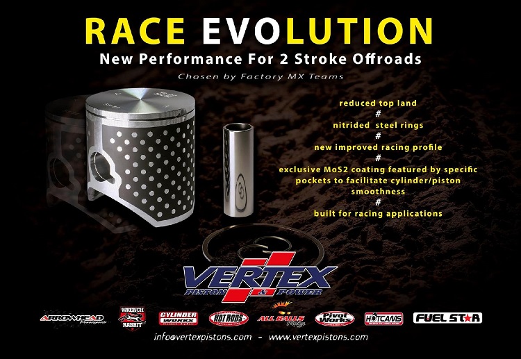 Vertex Pistons hat eine neue Version für 2-Takt-Offroad-Kolben namens Race Evolution auf den Markt gebracht. Diese exotischen Kolben, die von den bestehenden unterstützten Rennteams getestet wurden, sind speziell für den Renneinsatz bestimmt und unterscheiden sich von den anderen Produktionslinien durch: