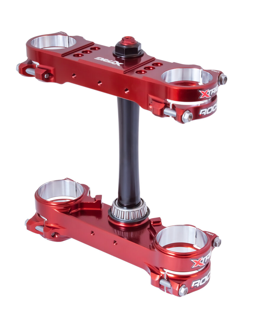 Das Revolutionary Opposing Clamp System kurz ROCS war eine der spektakulärsten und aufwändigsten Entwicklungen von XTRIG in den letzten Jahren. Die Vorteile dieses Systems im Vergleich zu einer konventionellen Gabelbrücke sind die geringere Verformung der Gabelstandrohre im Klemmbereich, was sich merklich auf das Ansprechverhalten der Gabel auswirkt. Aber auch die Konstruktion mit den beiden gegenüberliegenden Klemmschellen die durch den Selbsthemmungseffekt mehr Sicherheit gegen das Verdrehen der Gabel gewährleistet.