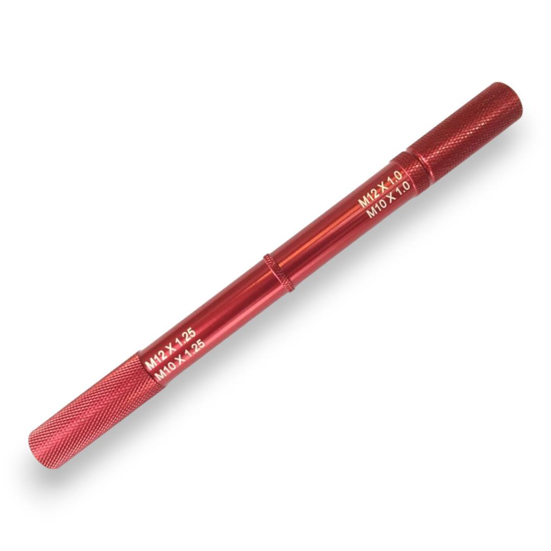 Werkzeug zum Herausziehen und Halten der Gabelkolbenstange zum Entlüften der Gabel zum Herausziehen der Kolbenstange zwecks Montage der Verschraubung 4 Gewindegrößen integriert, dadurch Aufnahme der gängigsten Kolbenstangen möglich 4 Gewindegrößen: M12 x 1.25 M12 x 1.0 M10 x 1.25 M10 x 1.0