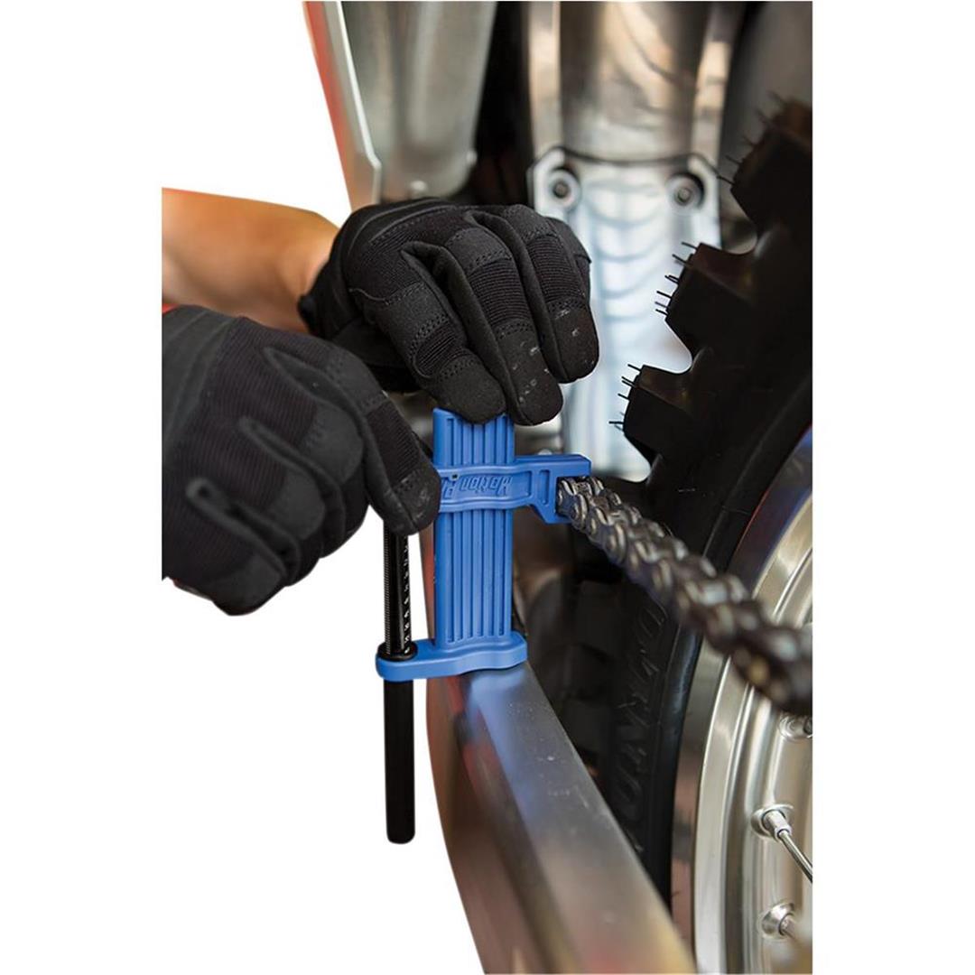 - Zwei Skalen zum Messen von Kettendurchhang und Abstand von Kette zu Schwinge in Millimeter